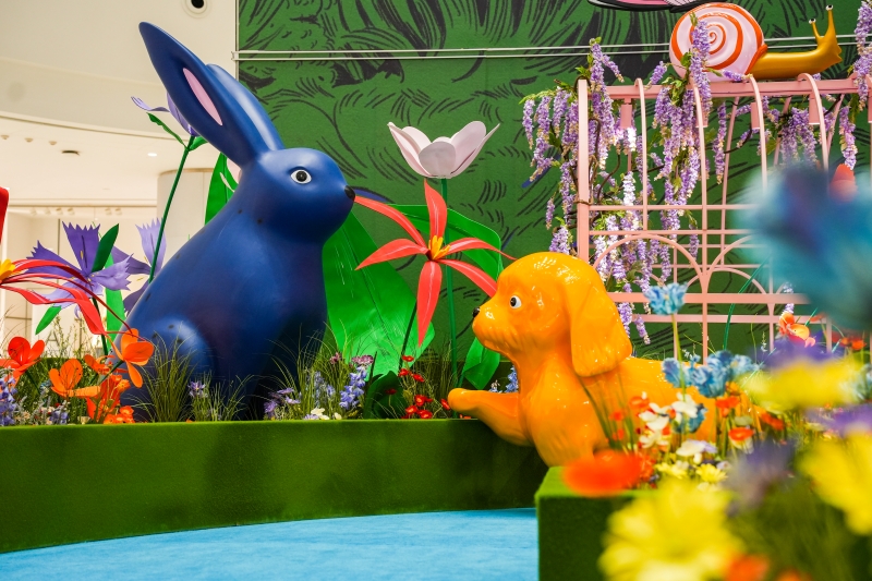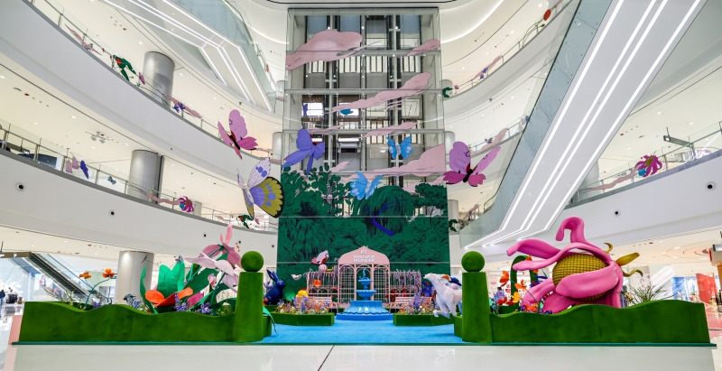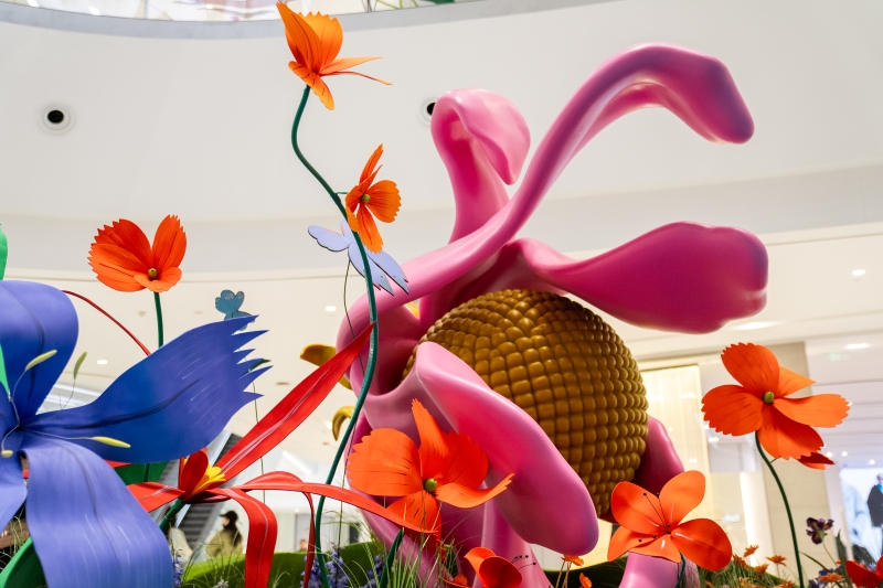 步入长沙IFS LG2西侧中庭,绮园花径四个角落的花圃生长着巨大的花木与动物形象,寓意爱情美满的花、福迭绵绵的蝴蝶、前途似锦的兔子、富贵吉祥的狗和事业稳固的大象,携带着美好祝福来到盎然绮域。每一花、一叶、一物,都呈现出生命的无限潜力和绵延福泽。